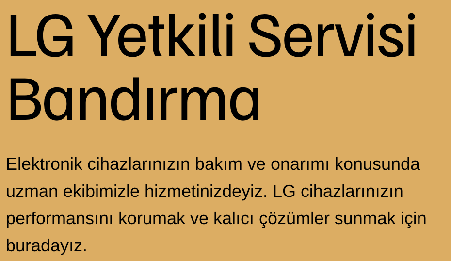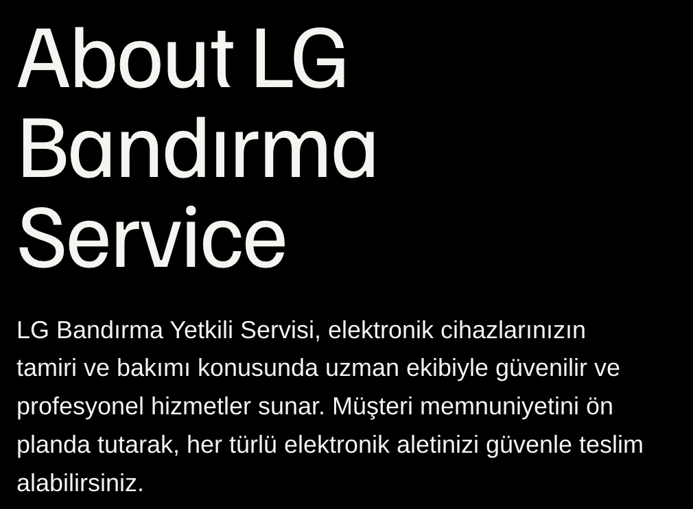 Bandırma’da 20 yılı aşkın süredir hizmet veren LG Yetkili Servisimiz, elektronik cihazlarınız için tam donanımlı bir çözüm merkezidir. Deneyimli teknisyen kadromuz ve son teknoloji ekipmanlarımızla, tamir, bakım ve servis işlemlerini hızlı, güvenli ve garantili şekilde gerçekleştiriyoruz.